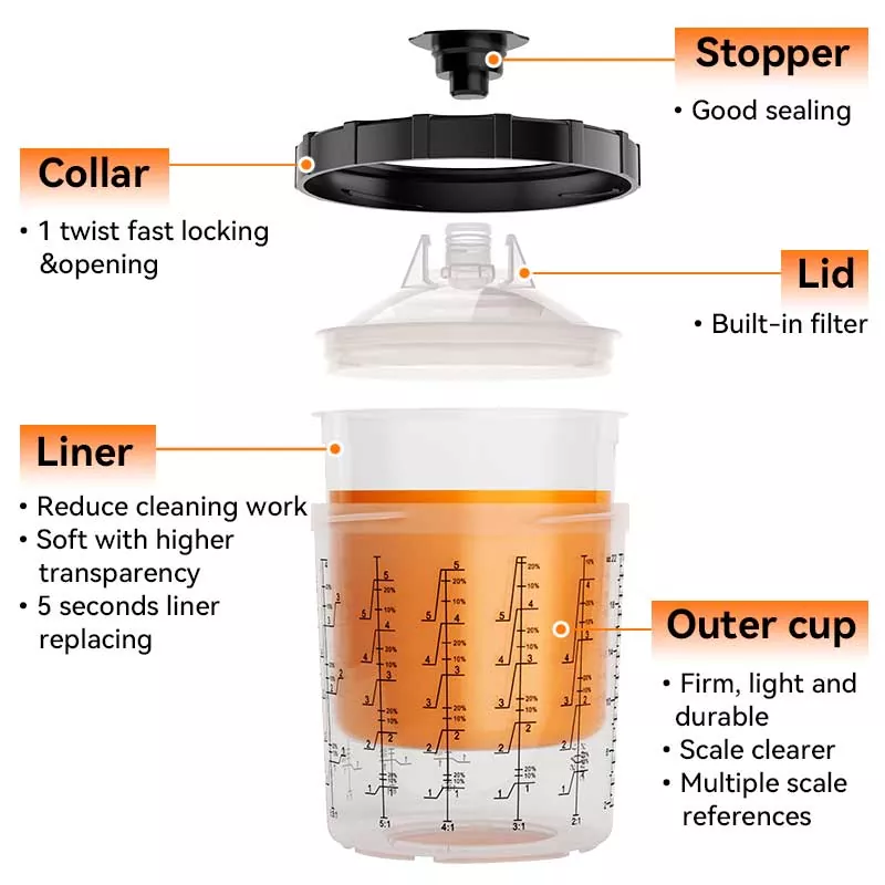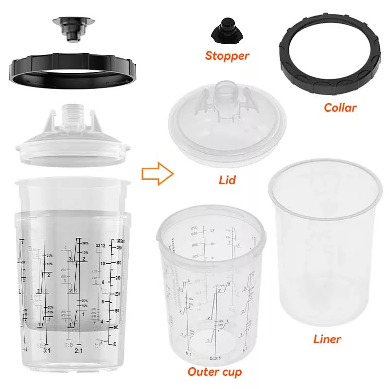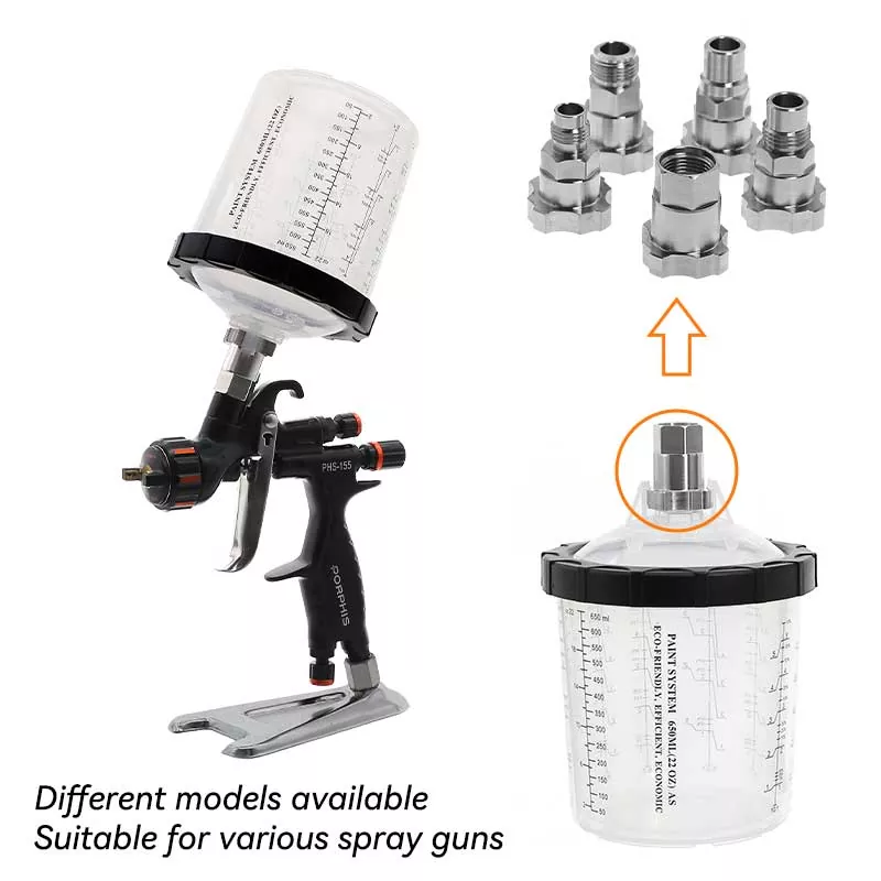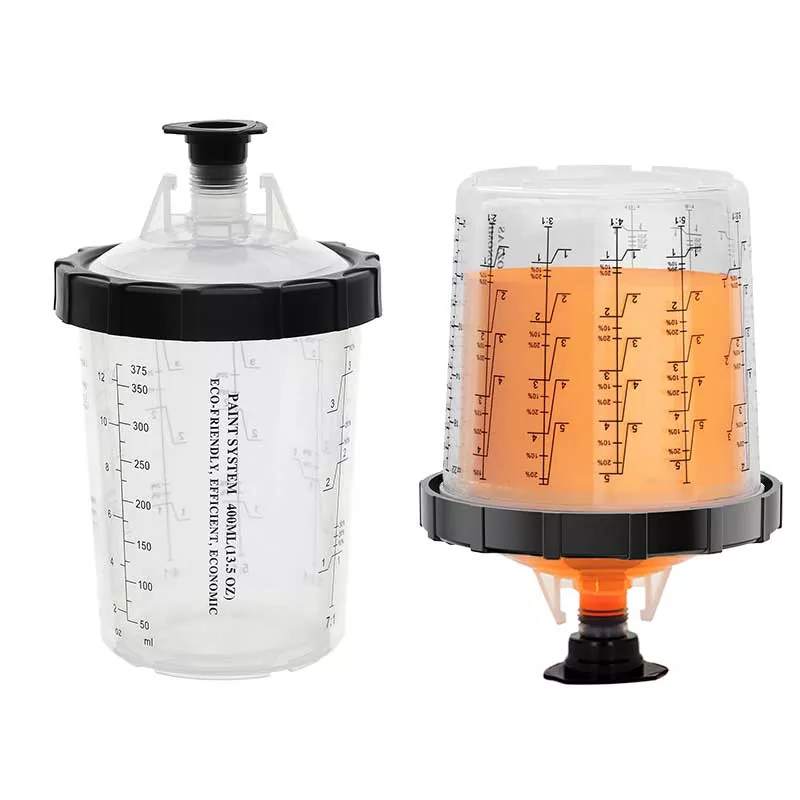 Sistem Cangkir Cat 400ML iki 1.0 biasane ngganti cangkir feed gravitasi tradisional amarga ora mung nyimpen cat, nanging uga nambah efisiensi lukisan. Khusus, desain kepileh saka spiral otomatis mudhun saka liner nalika lukisan ndadekake Paint digunakke kanthi; Kangge, ngunci cepet plus desain panggantos liner ngindhari ngumbah tuwung, saéngga proyek lukisan bisa digawa metu irit lan bola-bali. Kita duwe adaptor kanggo meh kabeh merek spray gun ing pasar kanggo nyukupi kabutuhan pengalaman para penggemar bedhil semprotan sing beda. Adaptor digawe saka stainless steel, kang tahan kanggo Paint karat lan banget awet. Kombinasi nyenyet saka liner karo tutup mesthekake yen sistem tuwung ora bocor Paint nalika lukisan, lan ndhukung panyimpenan long-term saka Paint digunakake supaya sampah.
