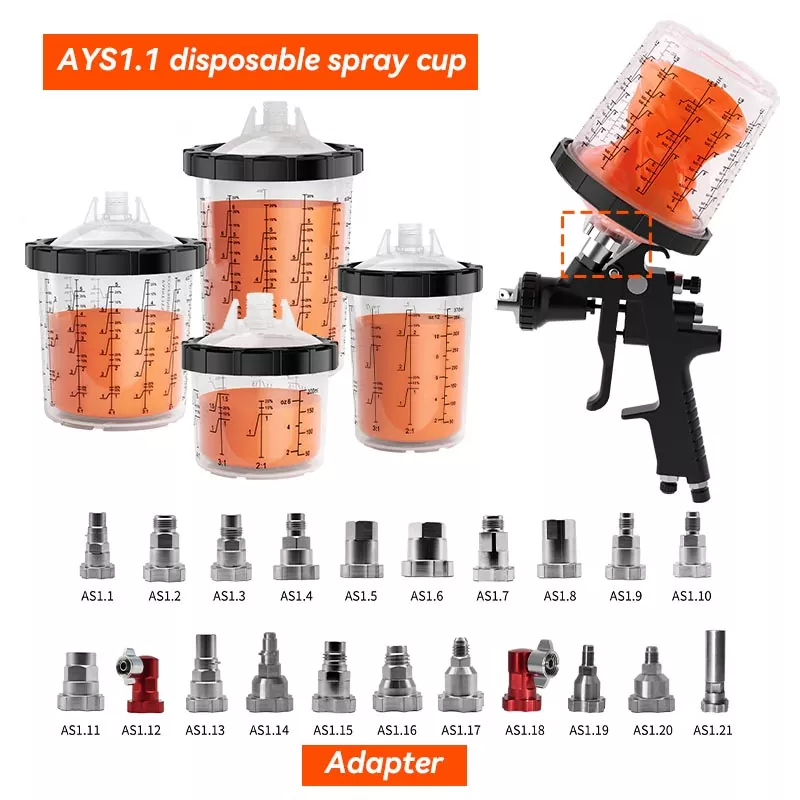 Piala semprot sing bisa digunakake AYS1.1 kompatibel karo adaptor Pps1.0 Series. Kanthi adaptor kasebut, bisa dicocogake kanthi apik kanggo bedhil semprotan lan bisa digunakake ing posisi apa wae tanpa risiko dripping cat.