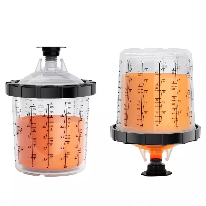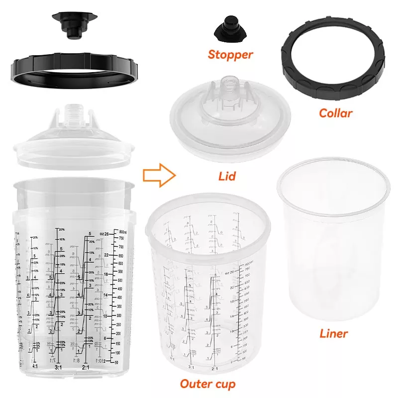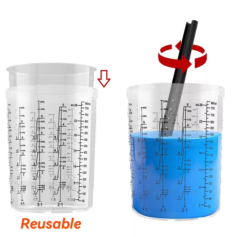 Piala njaba sing bisa digunakake maneh kanthi campuran rasio skala. Lebokake lapisan nganggo liner menyang cangkir njaba lan nyampur cat kasebut langsung ing biaya bahan utawa ora nggunakake cangkir sing bisa dicampur tradisional.