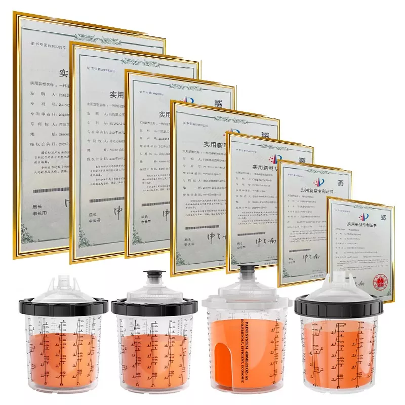 Sistem Piala Semprotan Salib sing dienggo ing limang bagean: cangkir njaba kanthi skala, liner sing bisa digunakake, tutup karo filter lan tutup, lan plug kanthi pangkalan. Sistem iki gabungke pirang-pirang fungsi kayata nyampur, nyampurake cat, nyemprot, nyemprot, nyemprotake proses persiapan kanggo tuku cairan semprotan, lan nyimpen biaya corak kertas sing kapisah lan nyampur cair cair.