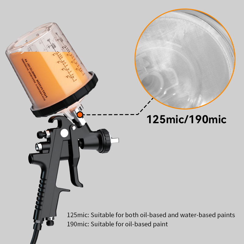 • Filter terintegrasi sing dibangun kanggo cat cat sing unggul: Fitur Cup Semprotan Piala Dibuwang ing taun 190-an (cat basis minyak) lan 125μ (cat banyu), saringan nyaring kanthi efektif nalika nyukir gloss cat kanthi 20%.