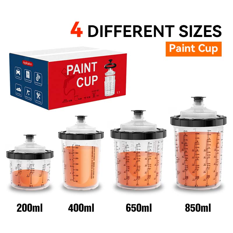 Adhedhasar panaliten pasar, cawan cat kasedhiya ing papat spesifikasi kapasitas: 200ml, 450ML, lan 850mL, kanthi sentuhan panggunaan sing beda-beda, apa wae kanggo nyemprotake panggunaan. Kajaba iku, struktur tuwung utama wis dioptimalake kanggo mesthekake aliran cat lancar, nyuda clogging lan limbah.